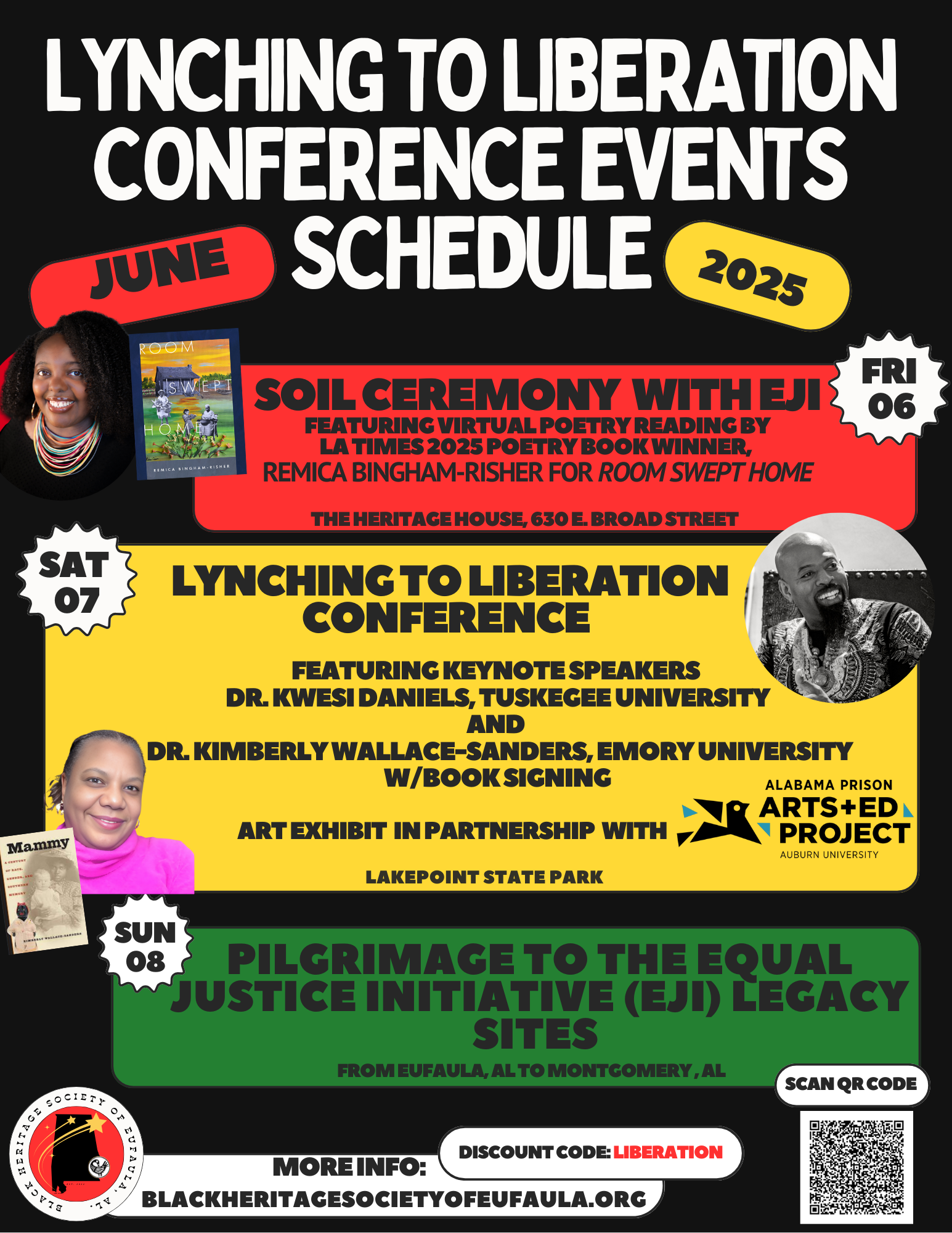 Day One features a sacred soil ceremony to memorialize lynching victim William "Willie" Jenkins at the Heritage House (formerly Wellborn House) with a virtual poetry reading by Remica Bingham-Risher, Los Angeles Times 2025 Poetry Book Winner. An Equal Justice Initiative representative will participate.