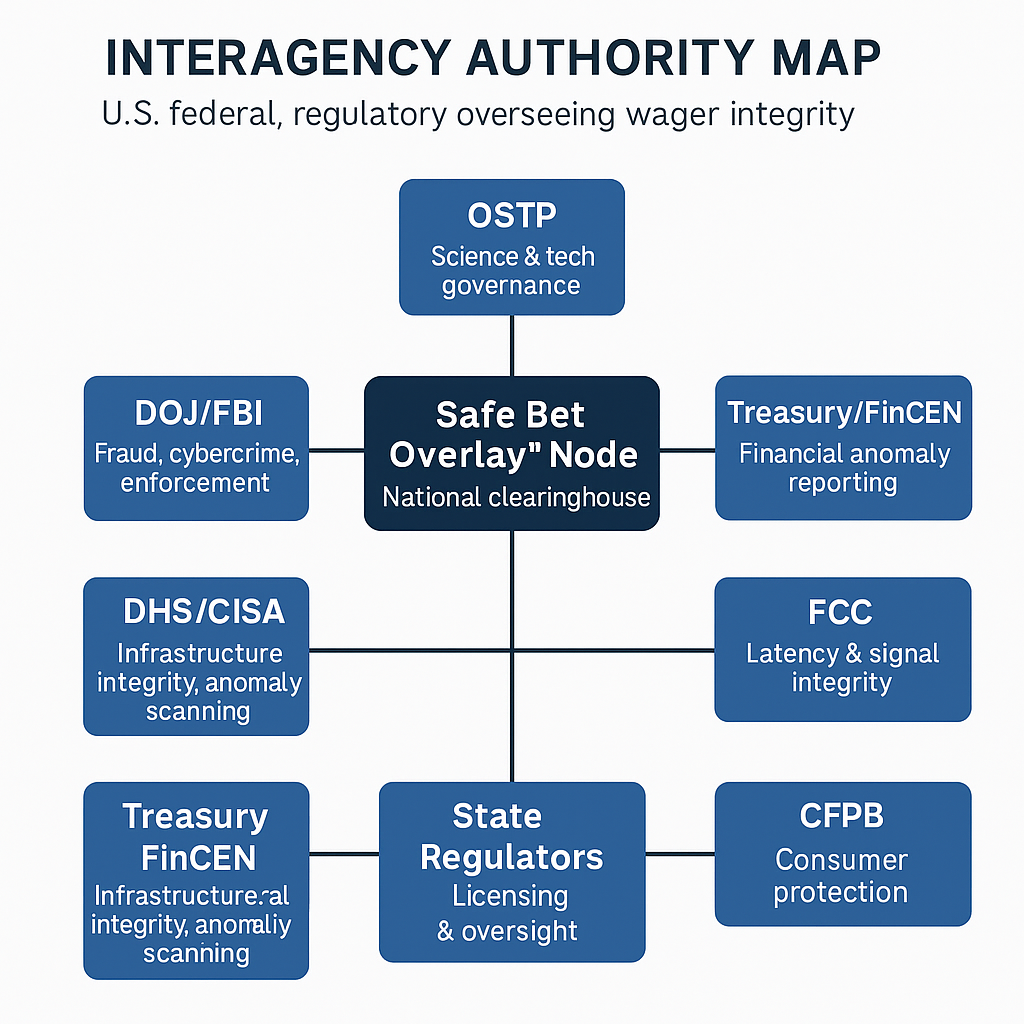 The Safe Bet Overlay™ Interagency Authority Map illustrates a groundbreaking national framework uniting U.S. federal and regulatory agencies under one coordinated integrity infrastructure for real-time sports-wager.