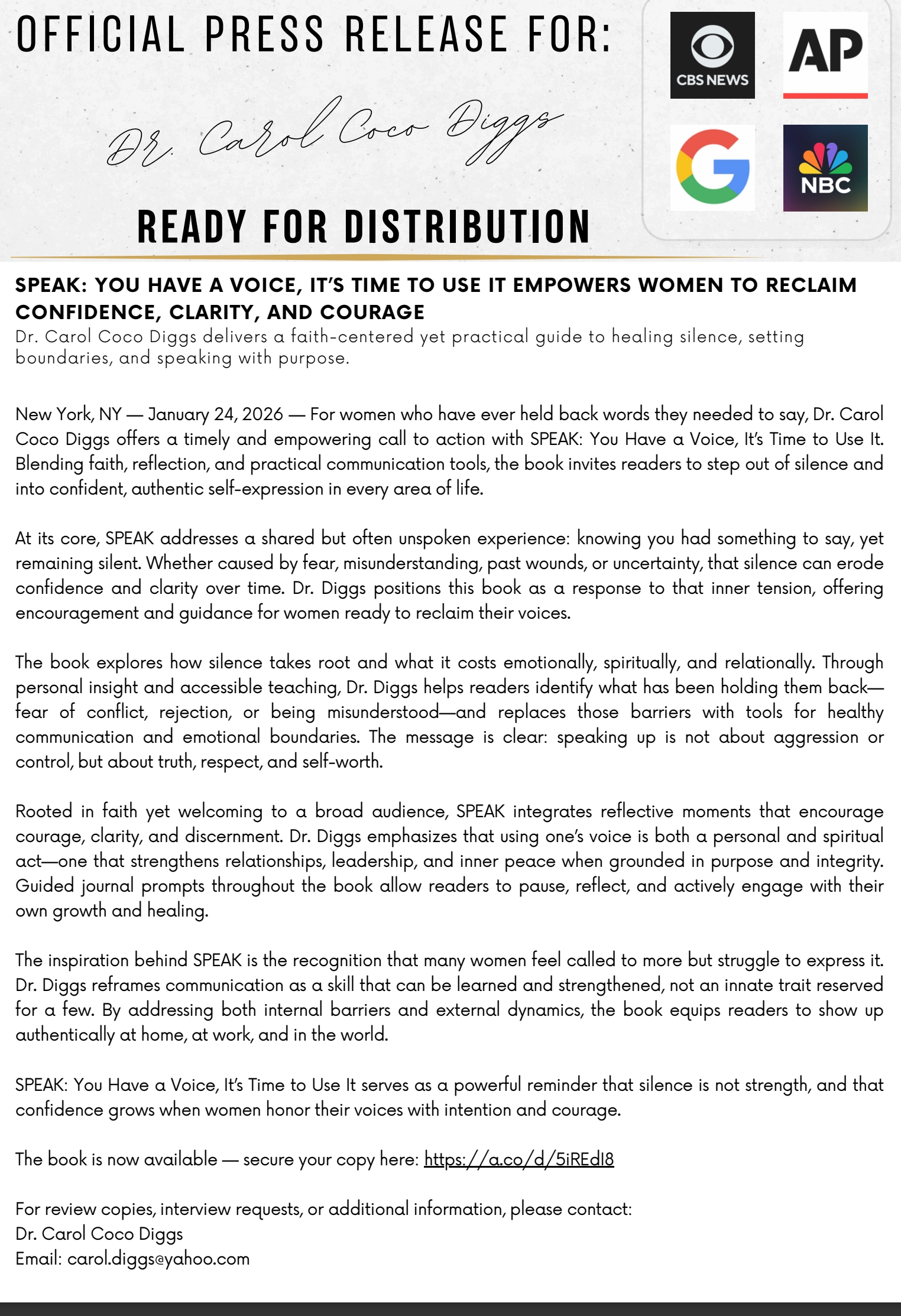 New York, NY, February 06, 2026 --(PR.com)-- For women who have ever held back words they needed to say, Dr. Carol Coco Diggs offers a timely and empowering call to action with SPEAK: You Have a Voice, It's Time to Use It. Blending faith, reflection, and practical communication tools, the book invites readers to step out of silence and into confident, authentic self-expression in every area of life.