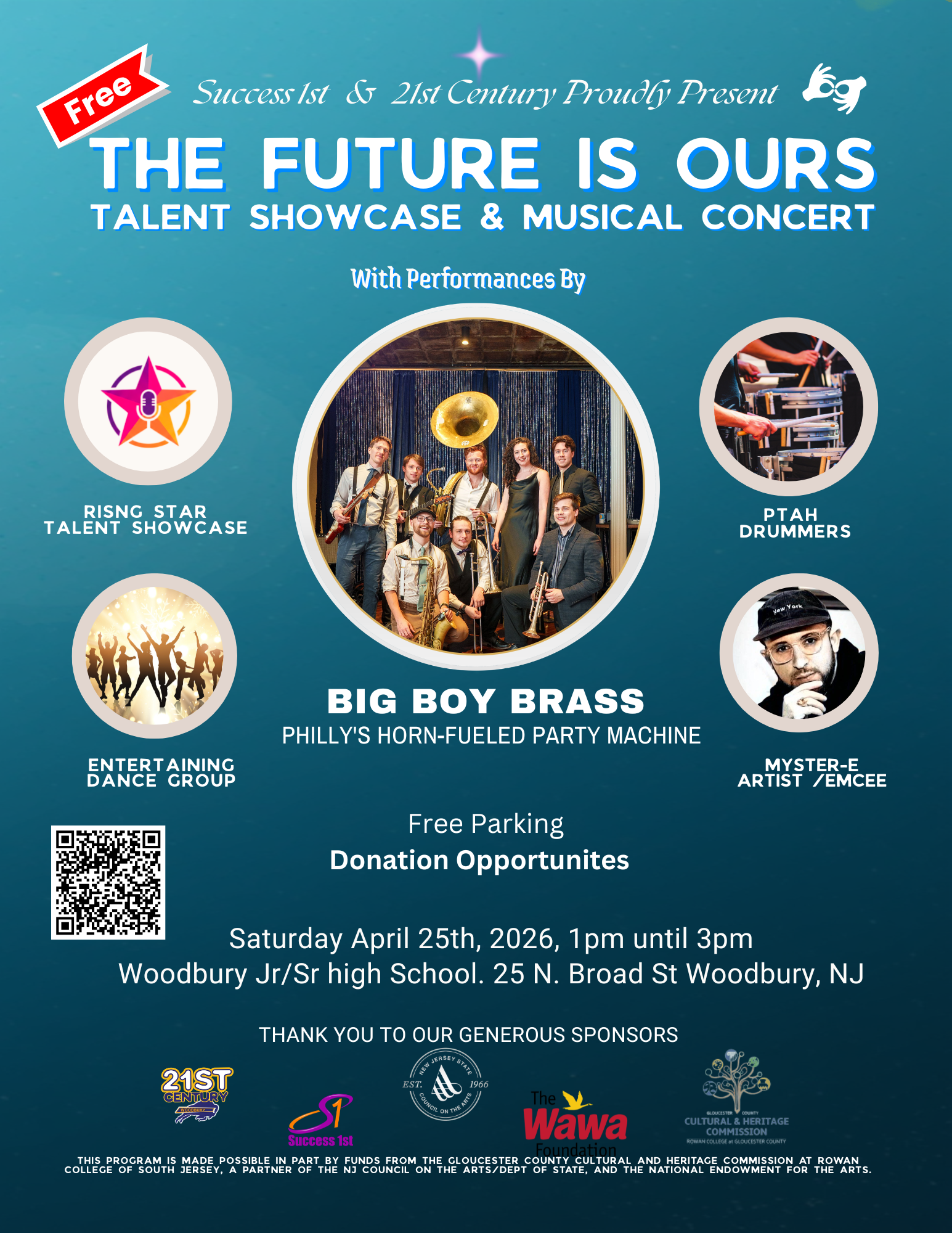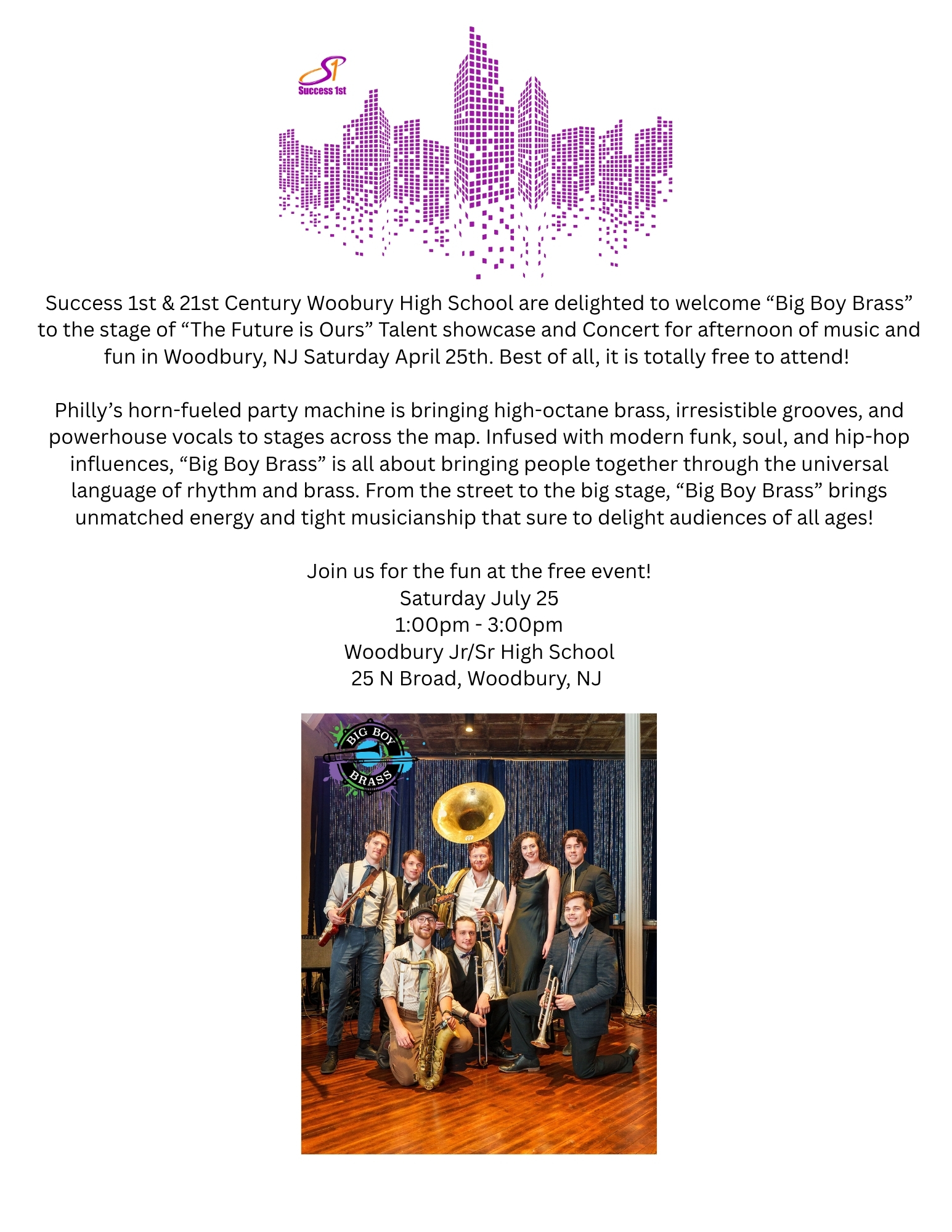 Woodbury, NJ, April 13, 2026 --(PR.com)-- Success 1st & 21st Century Woodbury High School are delighted to welcome Big Boy Brass to the stage for “The Future Is Ours” Youth Talent Showcase and Concert—an afternoon of music, creativity, and community celebration—on Saturday, April 25, from 1:00 p.m. to 3:00 p.m. at Woodbury Junior/Senior High School.