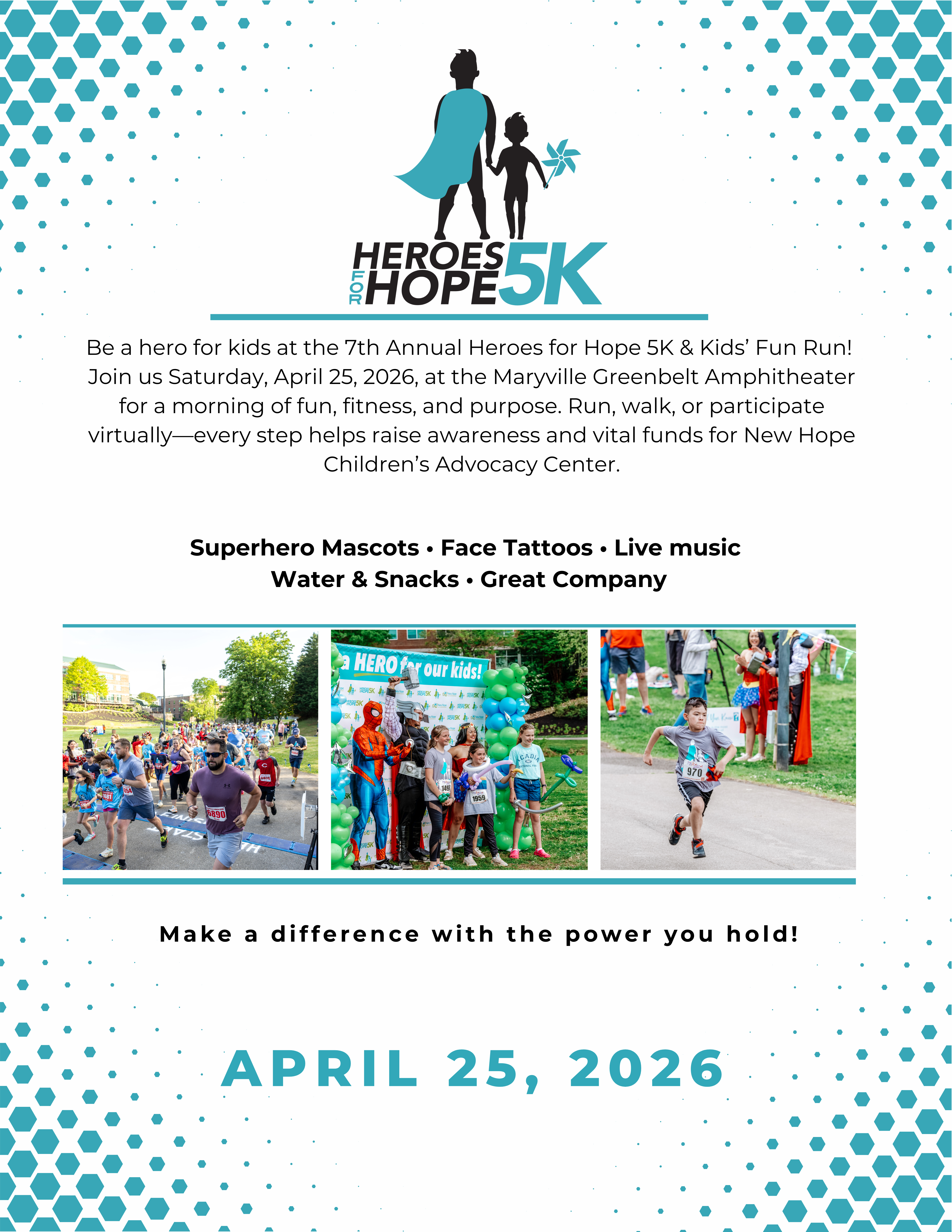 Held during Child Abuse Prevention Month, the Heroes for Hope 5K & Fun Run brings the community together to raise awareness and critical funding for children and families affected by abuse and trauma throughout Blount County. All proceeds from the event directly support the life-changing work of New Hope Children’s Advocacy Center, which provides advocacy, resources, and a path toward healing for those in need.